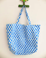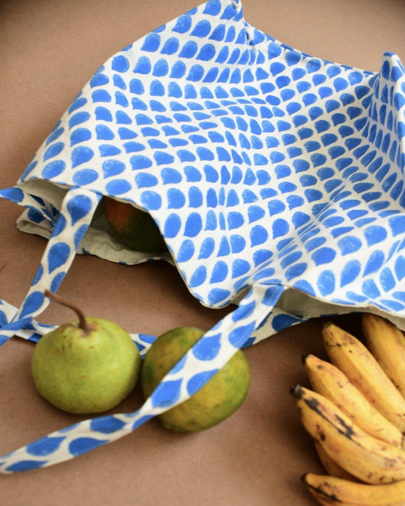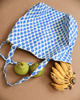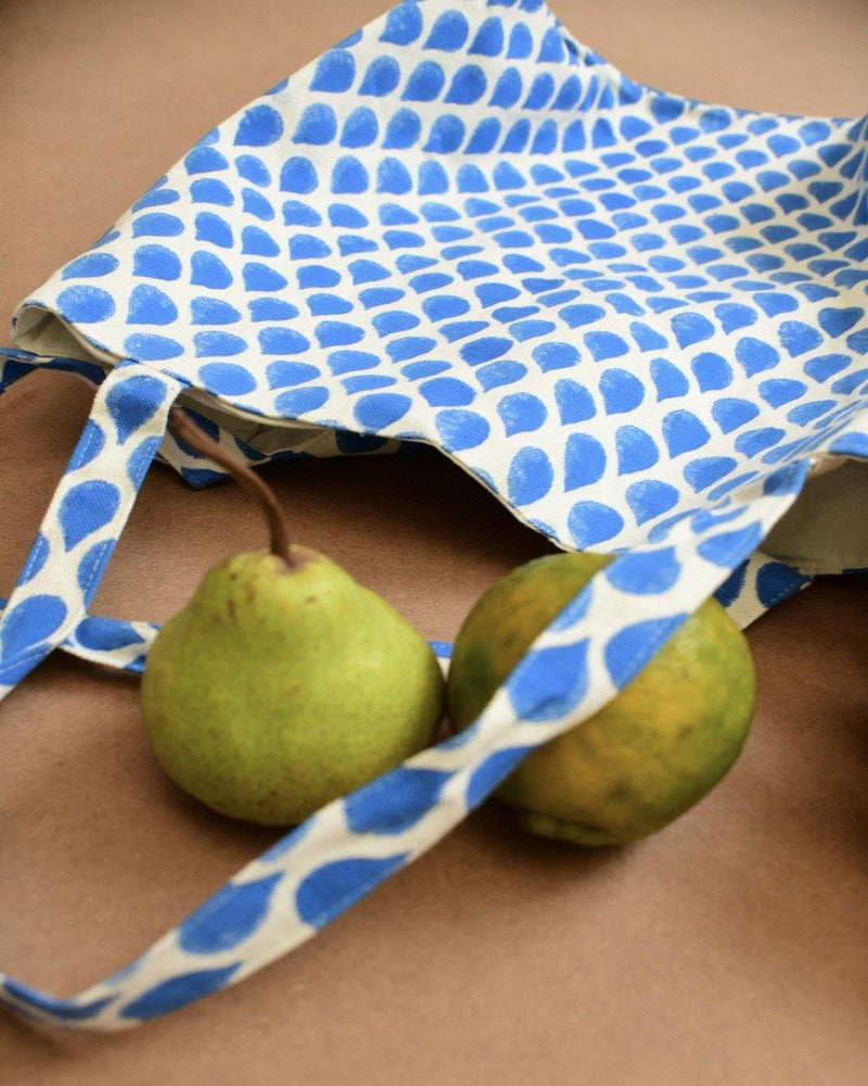 Our bright cobalt blue water droplets pure cotton canvas totes are ideal for carrying heavy items such as laptops, veggies and books. You can take them to the beach with your sunscreen, and give them a vacation too! Hand block printed in Rajasthan
