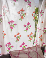 Orange and pink bougainvillea flowers block printed on soft cotton fabric on our new curtains! The colours are so cheerful, and the print so Indian. It reminds us of the gorgeous summers in North India every time we look at them.