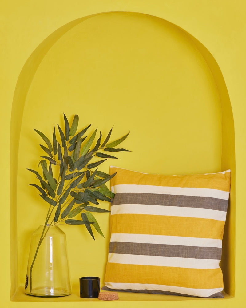 Dhoop Chanv, named so for the yellow of sunlight and grey of the shade is a beautiful fabric- thick cotton slub with screen printed stripes
