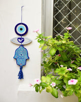 Our new wall hanging with an evil eye, a hamsa hand, and an eye in the classic colours of Turkish Evil Eye of white and blue. Hang it up outside your house or indoors- it adds charm nonetheless. Hand formed and painted by blue potters in Jaipur. Each piece is unique as it’s completely handmade. Each has a tassel in blue hanging below.